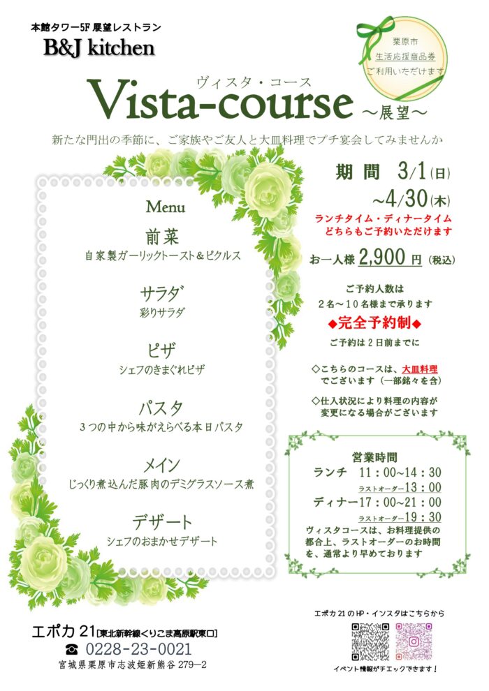 3月4月限定 Vistaコースのお知らせでございます。