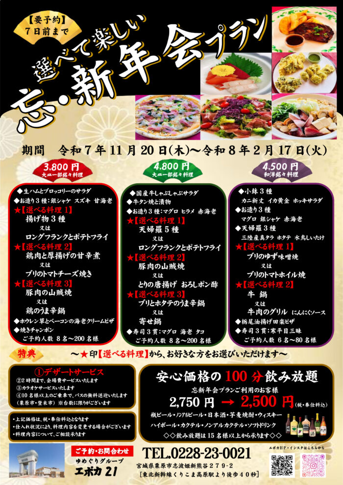 お料理が選べる、3つのプランをご準備いたしました。今年最後の締めくくり、新年のお祝いに、エポカ21で楽しいひとときをお過ごしくださいませ。